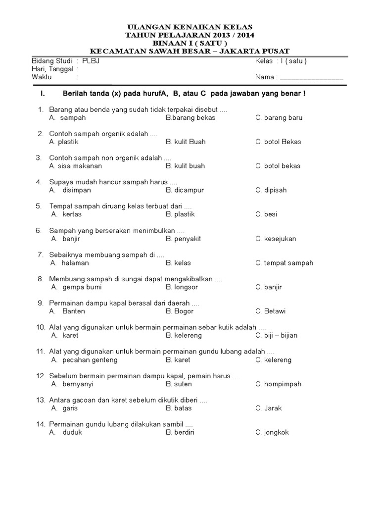 Soal latihan uas kelas 1 semester 1 kurikulum 2013. Bagi sobat yang sedang mencari berkas soal plbj pendidikan lingkungan dan budaya jakarta untuk bahan belajar mengadapi ujian sekolah sobat berada di situs yang tepat. 49 soal plbj kelas 4 semester 1 dan kunci jawaban 2021 2022 2023 png. Contoh soal pts kelas 5 semester 2 kurikulum 2013 yang coba saya bagikan ini tema 6 dan tema 7. Jumlah soal pilihan ganda 25 jumlah soal isian singkat 10 jumlah soal uraian 5 contoh contoh soal di dalamnya.